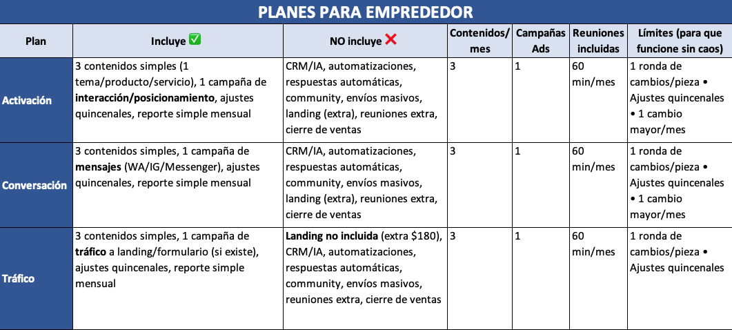 Contactos: en Plan 1–2 se entregan en las plataformas (Meta/IG/Messenger/WhatsApp). No se exportan a Excel/CRM salvo extra.